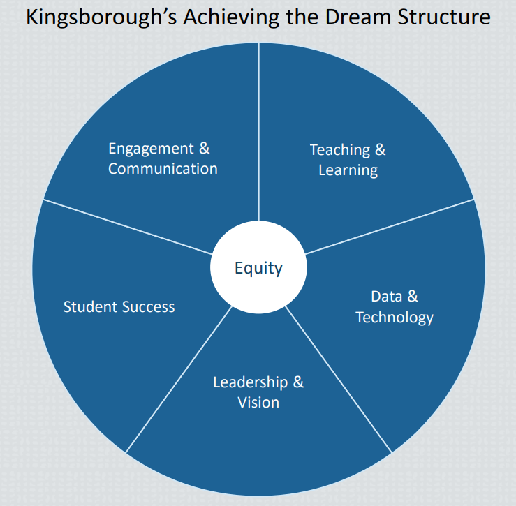 The image above represents KCC’s adapted framework. Equity is the focal point that guides our new student success initiatives, faculty development opportunities, strategic decision-making, college wide conversations, and institutional assessment priorities. This model also promotes intentional resource allocation to support these initiatives.