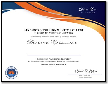 The Dean’s List at Kingsborough Community College recognizes the academic excellence of our matriculated students each academic term. We invite you to recognize our exceptional students and their academic excellence.